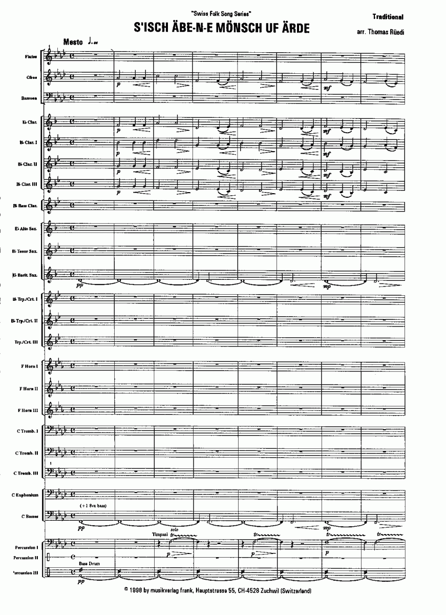 Zusatzinfo/Inhalt Es gibt wohl kein Volkslied, das die Volksseele mehr berührt als diese Melodie, der sich sogar der Schweizer Popstar Stefan Eicher angenommen hat. Es ist im übrigen das einzige Schweizer Volkslied, das in Moll gehalten ist. Das Arrangement von Thomas Rüedi ist schlichtweg meisterhaft und ergreifend. Dieses grossartige Stück wurde von der Brass Band des Schweizer Armeespiels auf ihrer Tournee in England gespielt und vom Sinfonischen Blasorchester Bern in Amerika aufgeführt.